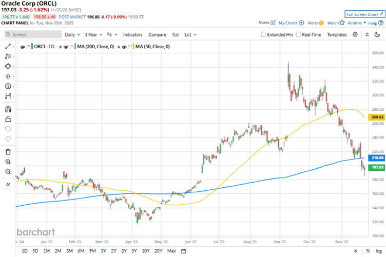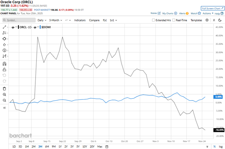 Oracle’s stock had reached a 52-week high of $345.72 on Sept. 10, but is down 43% from that level. Investor concerns about an inflated artificial intelligence (AI) bubble and high valuations in the sector have led to the stock declining. Over the past three months, Oracle’s stock has dropped by 16.3% over the past three months. On the other hand, the broader Dow Jones Industrial Average ($DOWI) is up 4% over the same period.
