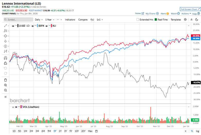 On Jan. 8, Lennox shares rose 2.3% after the company announced the launch of the Dave Lennox Signature® SLP99VK Gas Furnace, a high-efficiency heating system featuring an integrated Refrigerant Detection System (RDS) that reduces installation complexity and costs by eliminating the need for a separate kit. The new model delivers up to 99% efficiency and is dual-fuel compatible, enabling it to pair with an electric heat pump to optimize performance and energy use across varying weather conditions.