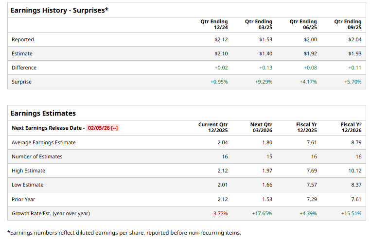 The credit bureau is expected to announce its fiscal fourth-quarter earnings shortly. Ahead of the event, analysts expect EFX to report a profit of $2.04 per share on a diluted basis, down 3.8% from $2.12 per share in the year-ago quarter. The company has consistently surpassed Wall Street’s EPS estimates in its last four quarterly reports.