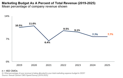CMOs report that their marketing budgets for 2025 remain flat at 7.7% of overall company revenue, according to a survey by Gartner, Inc. This is consistent with last year when marketing budgets represented 7.7% of overall company revenue (see Figure 1).
