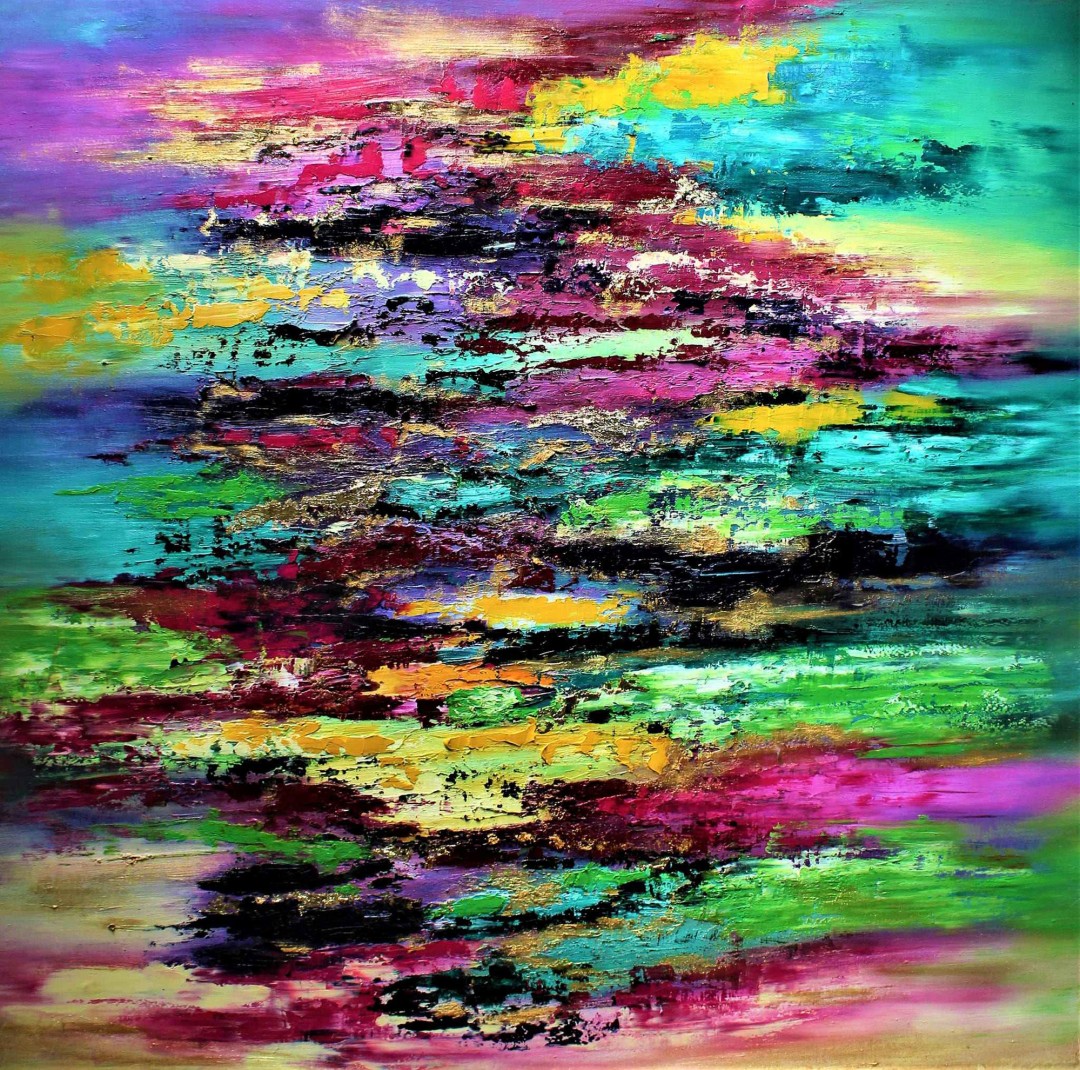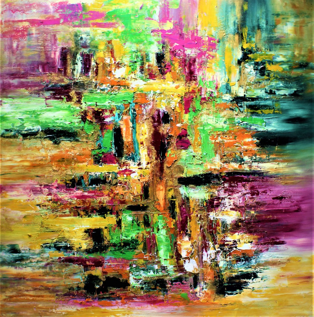 "State of Bliss", as the artist herself declares, is "a state of no mind. When time is but a suspended moment of being in the present." Swathing the canvas with her hallmark burst of colors, Hanna's work brings forward this blissful state of presence with a balance of decisive strokes and soft, melding edges. The resolute yet carefully distributed presence of dense hues ground the merry mix of colors, and harmonizes the overlapping textural layers to create a captivating work of abstract art.