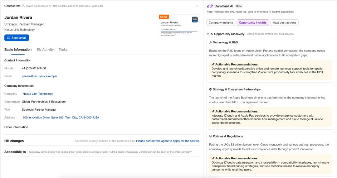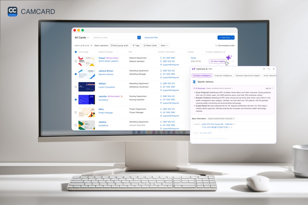 CamCard, the global leader in AI-powered business networking, today launched CamCard Business 2.0. Built specifically for teams and enterprises to share and manage their business networks, CamCard Business integrates AI capabilities into pre-meeting research and conversation capture. The upgrade introduces two new features—AI Insights and AI Voice Note —that transform scattered information into actionable intelligence for effective business conversion.