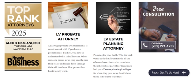 The Giuliani Law Firm is a Las Vegas-based legal practice focused on probate law and estate administration. The firm is led by Alex Giuliani, who provides legal guidance to individuals and families navigating probate proceedings, estate disputes, and asset distribution under Nevada law.