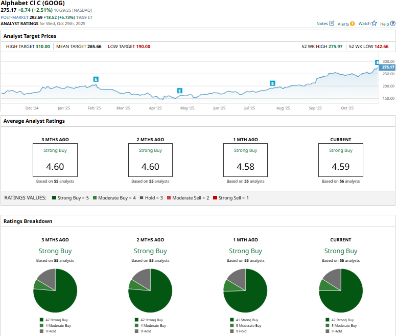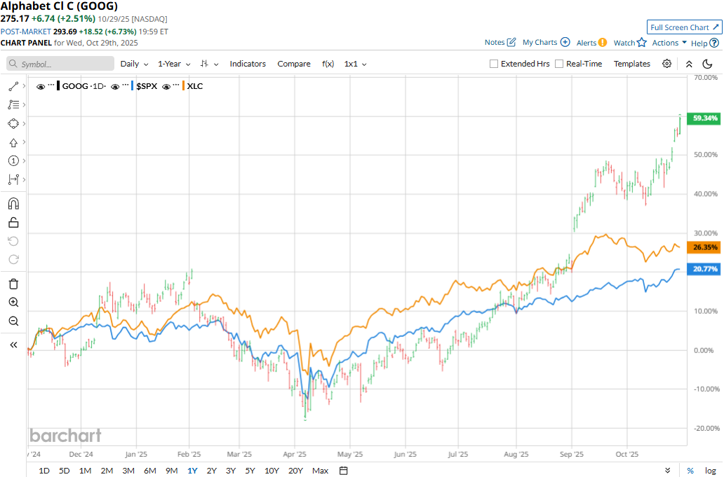 Alphabet has notably outperformed the broader market over the past year. GOOG stock has soared 60.8% over the past 52 weeks and 44.5% in 2025, compared to the S&P 500 Index’s ($SPX) 18.1% gains over the past year and 17.2% returns on a YTD basis.
