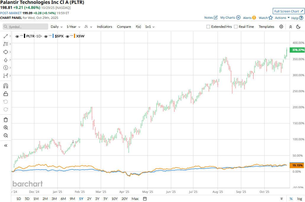 Narrowing the focus, Palantir has also outpaced the SPDR S&P Software & Services ETF’s (XSW) 4.7% gains on a YTD basis and 16.2% returns over the past year.