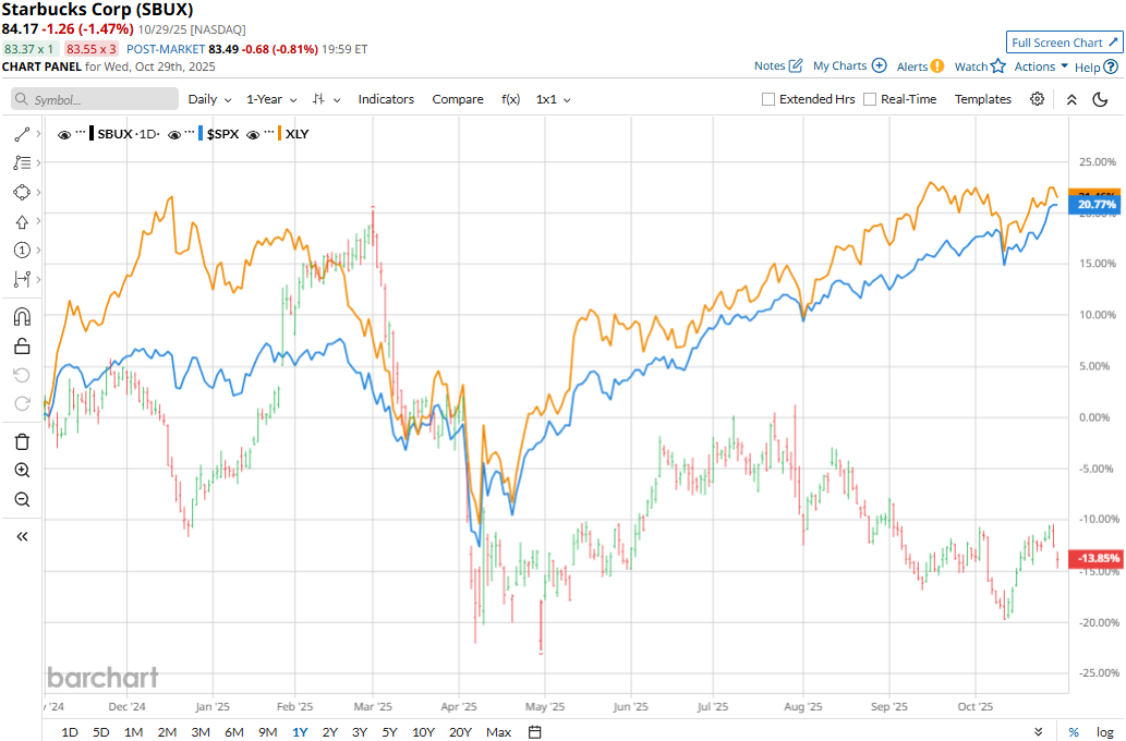The coffee giant has continued to lag behind the broader market over the past year. SBUX stock has dropped 7.8% in 2025 and 13.6% over the past 52 weeks, compared to the S&P 500 Index’s ($SPX) 17.2% gains on a YTD basis and 18.1% surge over the past year.