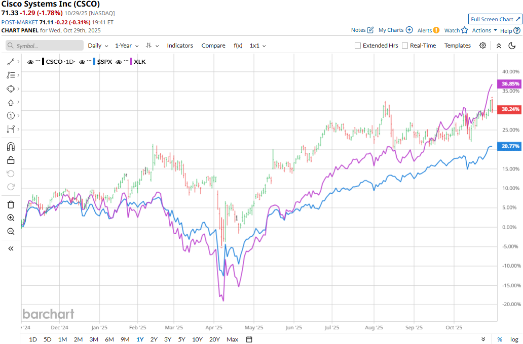 Cisco Systems’ stock has outperformed the broader market over the past year. CSCO stock has gained 20.5% on a YTD basis, outpacing the S&P 500 Index’s ($SPX) 17.2% gains in 2025. Over the past 52 weeks, CSCO is up 28.1% compared to SPX’s 18.1% returns during the same time frame.