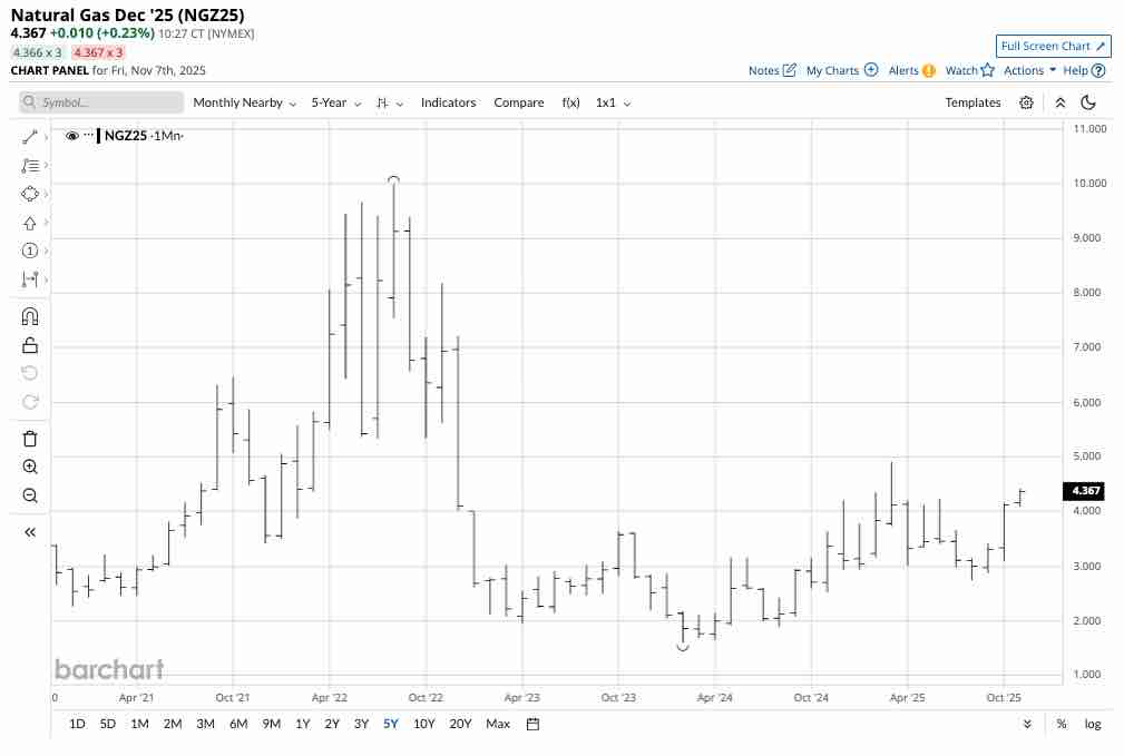 The six-month chart of NYMEX natural gas futures for December 2025 delivery highlights the bullish trend since the low on October 17, 2025.