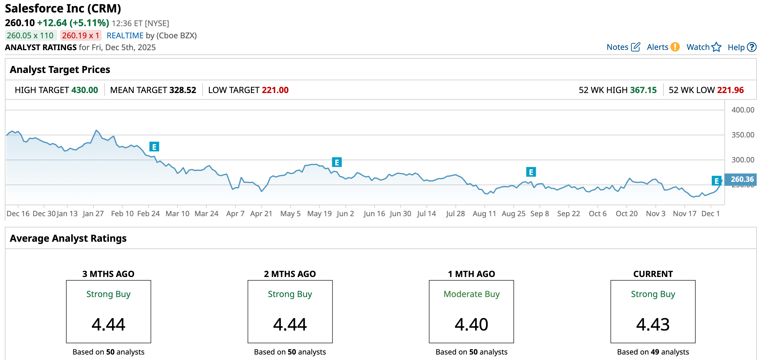 Analysts, on average, see the stock heading to $328.52, suggesting about 26% upside from current levels. And for the most bullish voices on the Street, the potential is even bigger. The highest target of $430 implies Salesforce could surge nearly 65% if the company regains momentum.