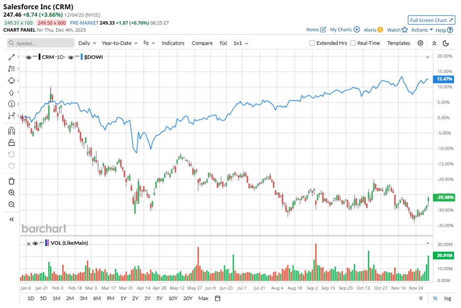 Salesforce, with a market capitalization of roughly $235.6 billion, has seen its stock tumble nearly 22% in 2025. That drop doesn’t just put CRM behind the Dow Jones’ double-digit gains. It also leaves the company trailing its own tech peers by a wide margin. The technology S&P 500 Technology Select Sector SPDR (XLK), a popular benchmark for the sector, is up an impressive 21.92% this year, highlighting just how sharply Salesforce has fallen out of step with the broader tech rally.