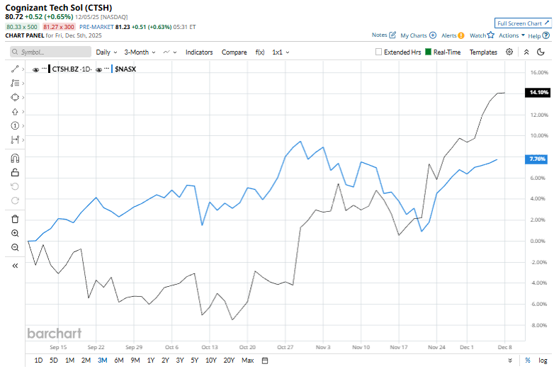 However, shares of the tech company have fallen 11.1% from its 52-week high of $90.82. Cognizant’s shares have decreased 12.4% over the past three months, underperforming the Nasdaq Composite’s ($NASX) 8.7% rise over the same time frame.