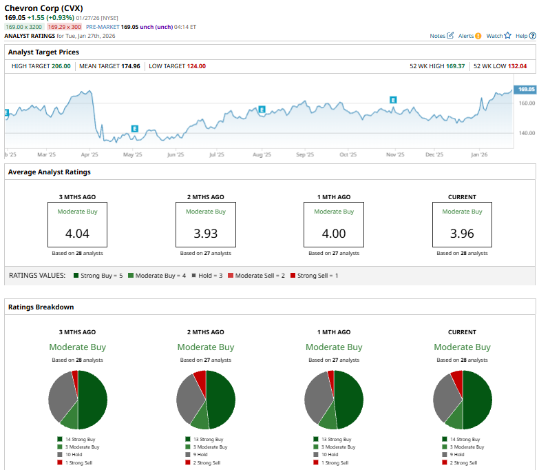 Among the 28 analysts covering CVX stock, the consensus is a “Moderate Buy.” That’s based on 14 “Strong Buy” ratings, three “Moderate Buys,” nine “Holds,” and two “Strong Sells.”