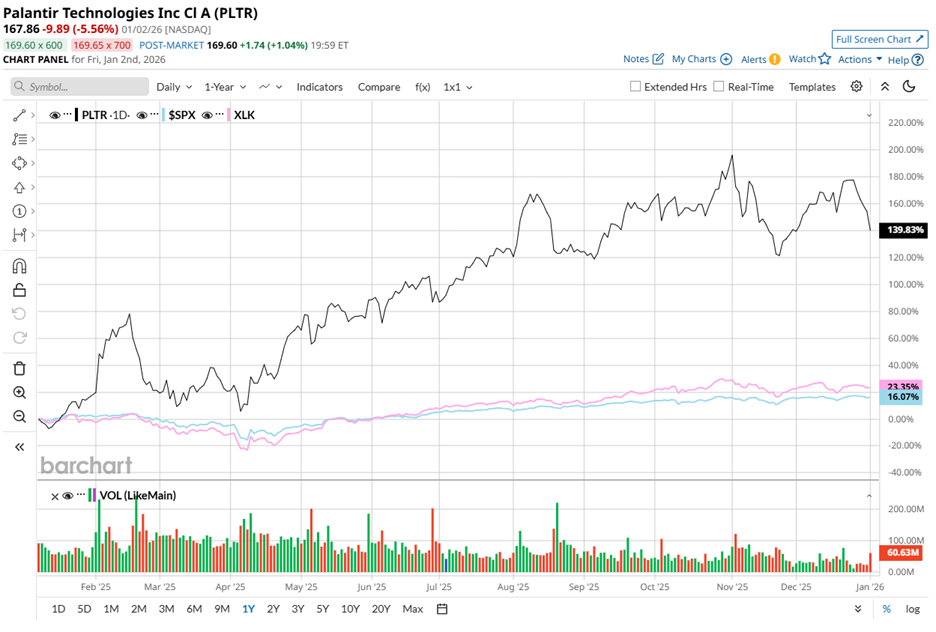 Stock performance already reflects lofty expectations. Over the past 52 weeks, PLTR stock surged 123.3%, while it gained 5.6% year-to-date (YTD). By comparison, the S&P 500 Index ($SPX) rose 16.9% over the same year and only marginally YTD, underscoring Palantir’s exceptional relative strength.