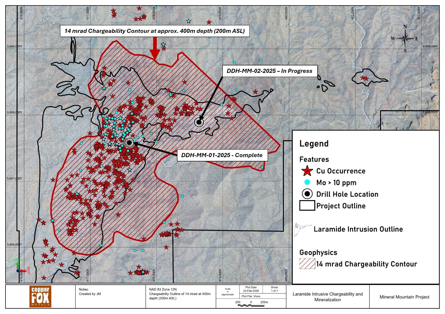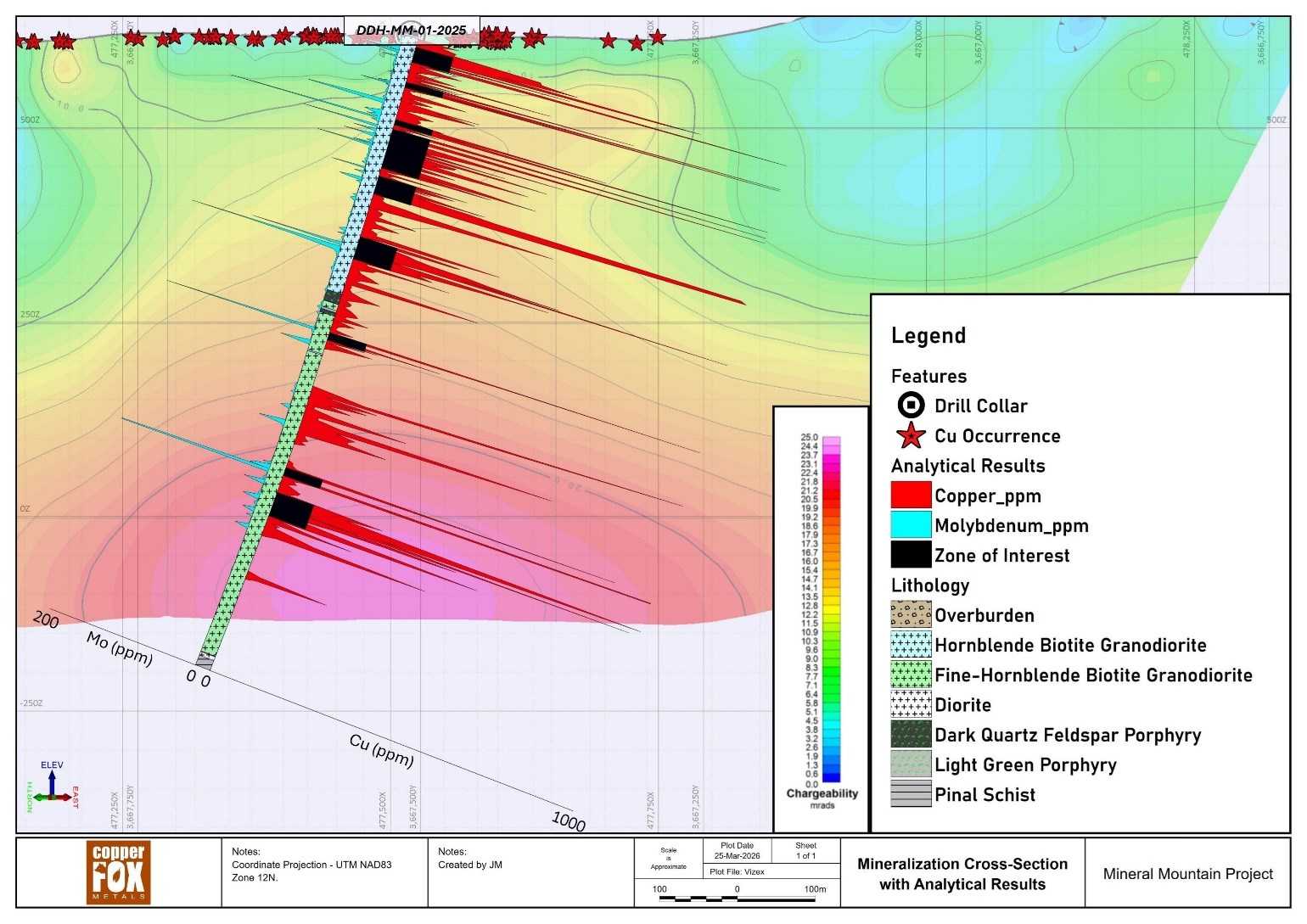Calgary, Alberta--(Newsfile Corp. - April 7, 2026) - Copper Fox Metals Inc. (TSXV: CUU) (OTCQX: CPFXF) (FSE: HPU) ("Copper Fox" or the "Company") and its wholly owned subsidiary, Desert Fox Mineral Mountain Co. ("Desert Fox"), are pleased to report that diamond drillhole (DDH) MM-01-2025 intersected the outer propylitic zone of a blind porphyry copper system. The overlapping, mixed assemblages of early stage, high temperature chalcopyrite-bornite-molybdenite veins with early potassic and later sericitic envelopes and lower temperature pyrite-epidote-chlorite veins with sericitic and propylitic envelopes indicate the broad spectrum of hydrothermal temperature and oxidization conditions in an evolved porphyry copper system exhibiting several phases of copper and molybdenum mineralization and indications of hypogene enrichment.