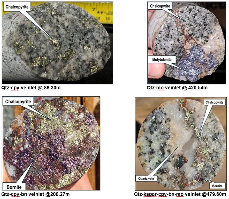 - The multiple assemblages of copper (Cu), copper-molybdenum (Cu-Mo) and molybdenum (Mo) veins and associated gangue minerals represent both proximal and distal styles of porphyry copper mineralization typically observed in the outer margin of a porphyry copper system.