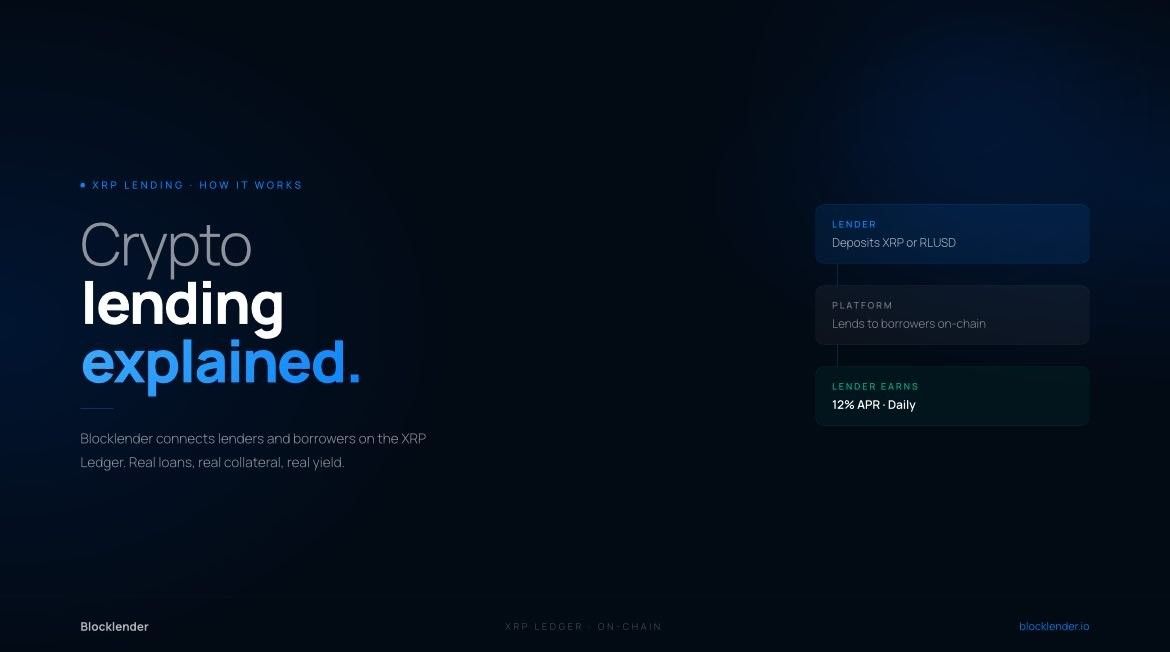 Blocklender is the XRP Ledger-native platform that brings this model directly to XRP and RLUSD holders. Here is how crypto lending works and what makes Blocklender’s implementation is distinct.